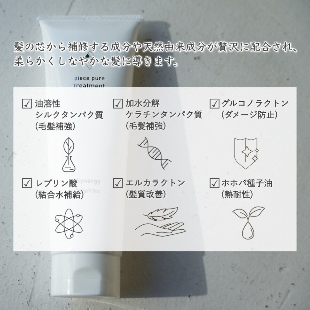 美しいツヤとしなやかな手触りを実現するために、天然由来成分が贅沢に配合されてます。